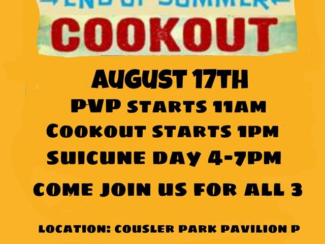 Come celebrate the end of the summer with us at Cousler park! We will be having a PvP Tournament followed by a cookout, and finish the day raiding for Suicune!